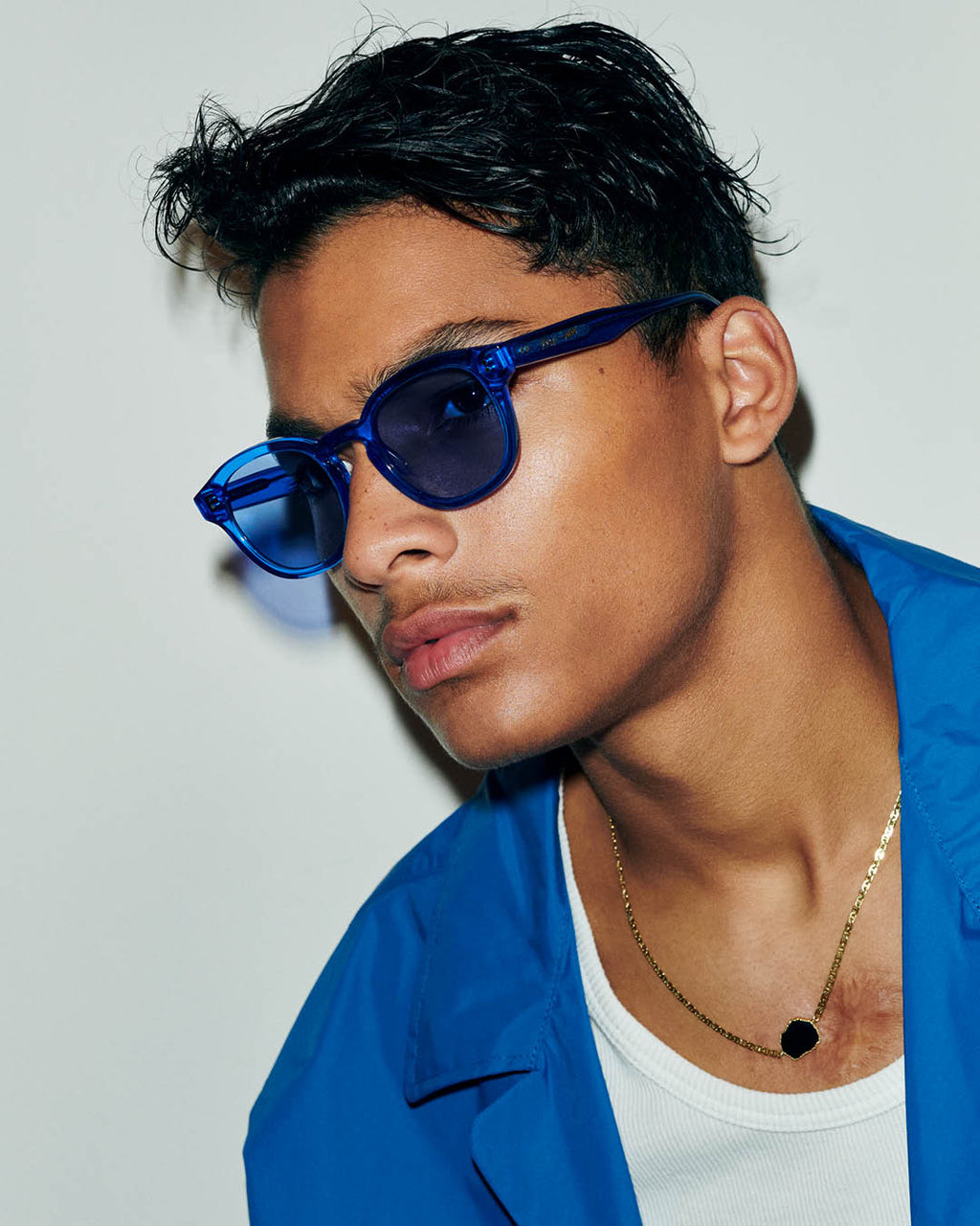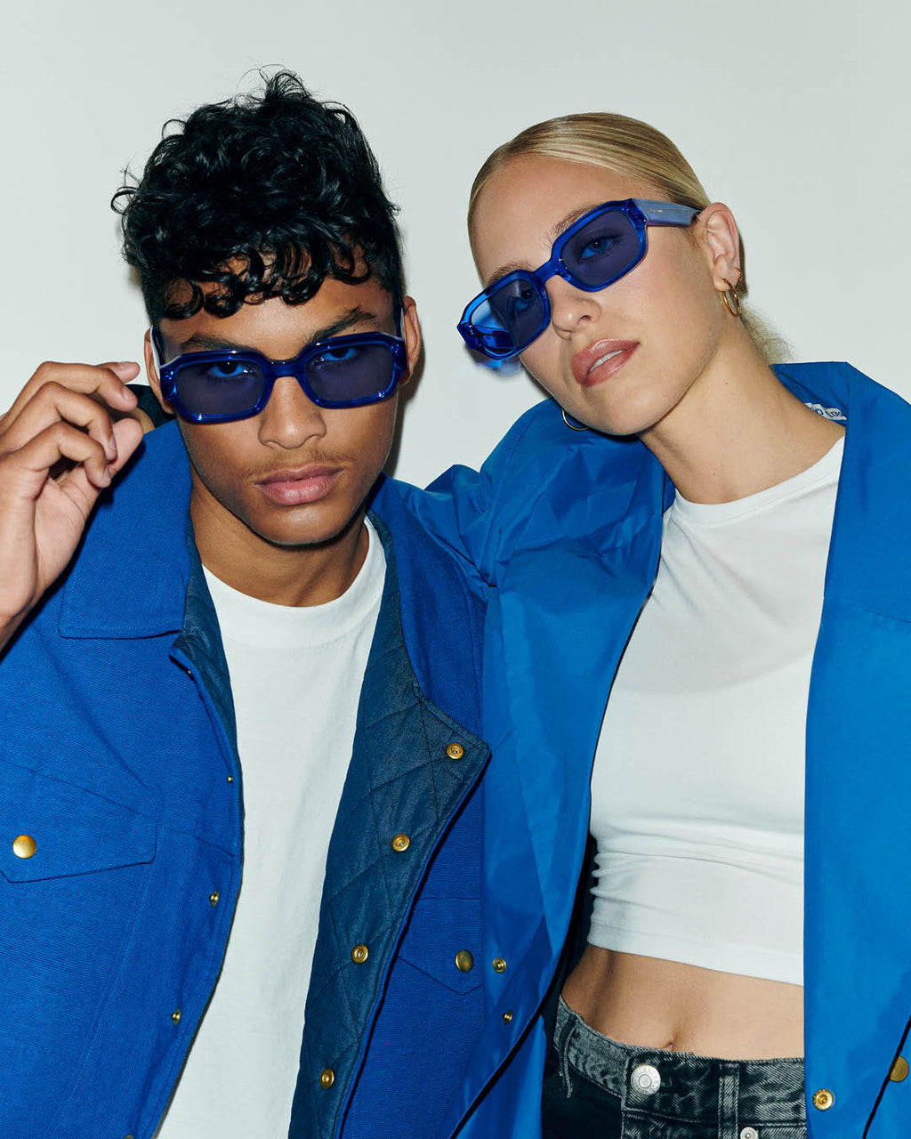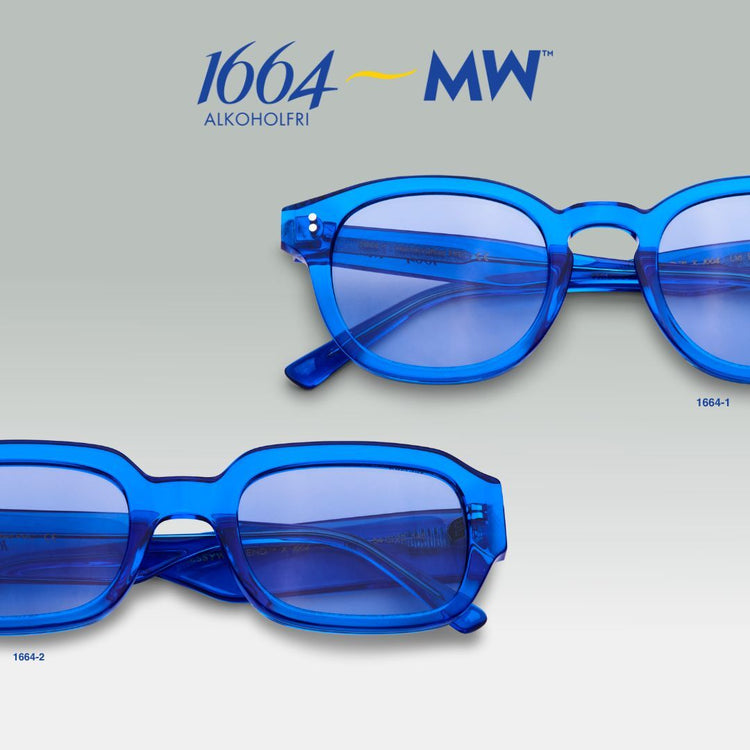 Deux modèles de lunettes de soleil conçus en collaboration avec 1664 Blanc avec le colori bleu bouteille emblématique de Blanc et estampillés avec le logo de la collaboration. Chaque paire a un identifiant unique sur la monture et est produite en 300 exemplaires.
